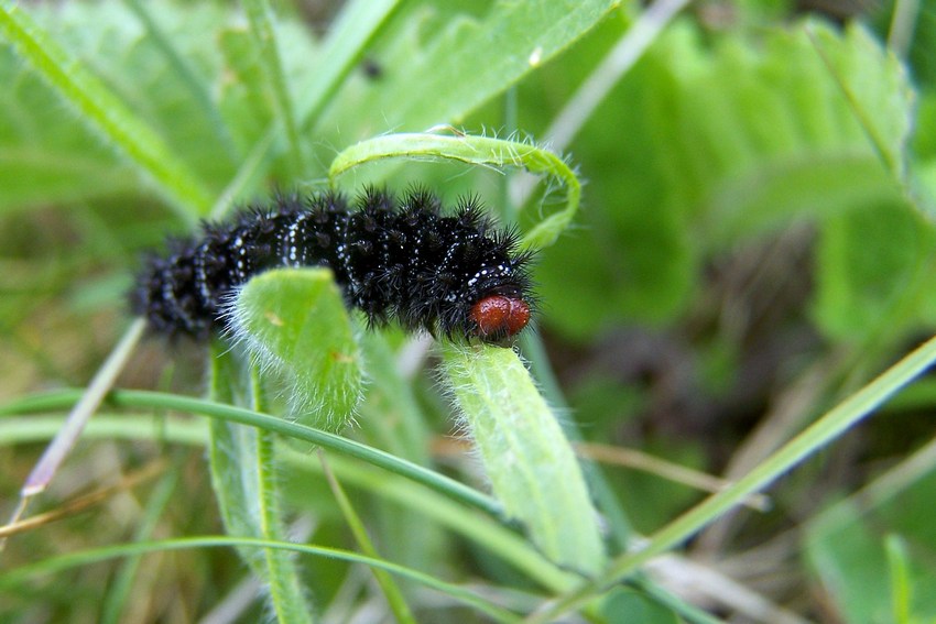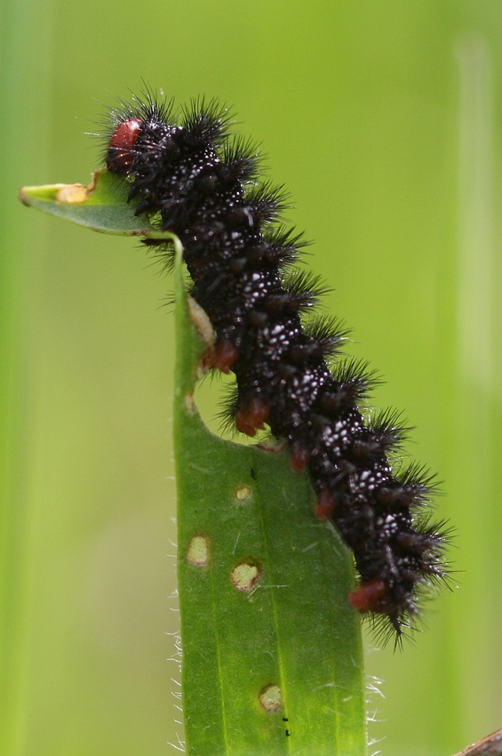 Larve von M. cinxia an Spitz-Wegerich fressend am Kaiserstuhl (NSG Badberg), Mai 2010.
