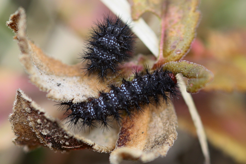 Larven des Wegerich-Scheckenfalters nach der Überwinterung an Großem Ehrenpreis, Obere Gäue (Schafhausen), März 2018.