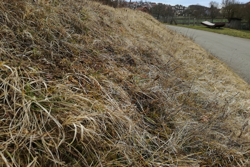 Larvalhabitat des Wegerich-Scheckenfalters in den Oberen Gäuen (Schafhausen); eine sporadisch genutzte, südexponierte Böschung.