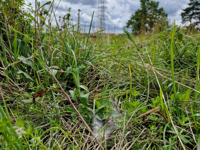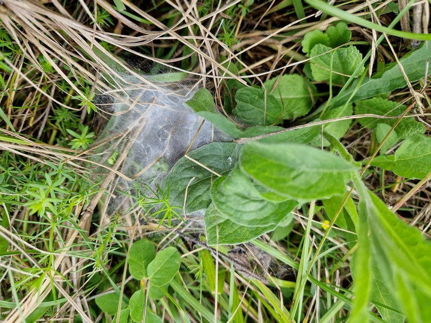 Weiteres Raupengespinst des Wegerich-Scheckenfalters vor der Überwinterung in den Oberen Gäuen (Oberjettingen), Juli 2023.