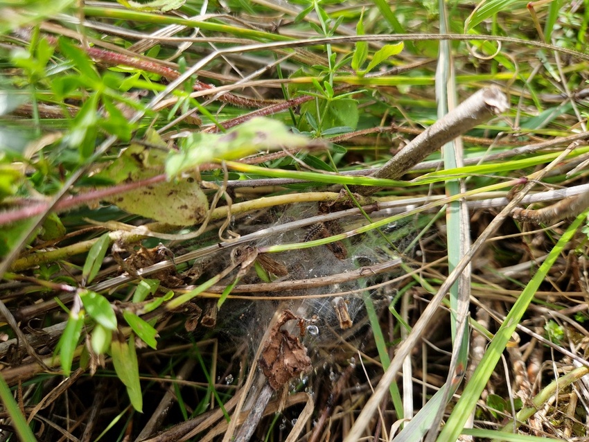 Raupengespinst von M. cinxia im Laravalhabitat in den Oberen Gäuen (Oberjettingen), Juli 2023.