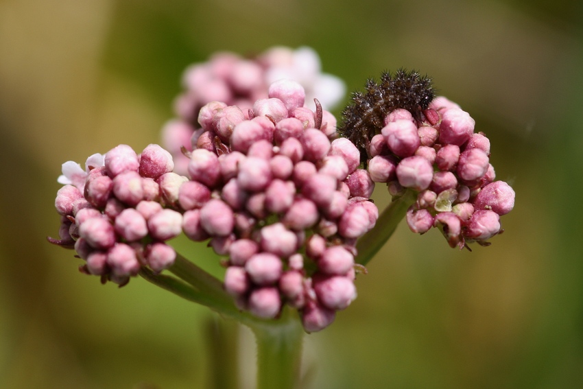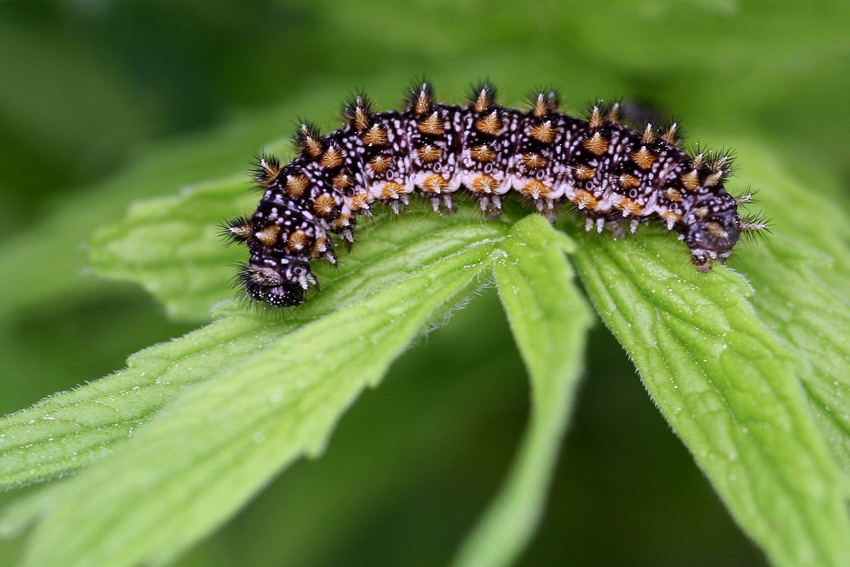 Erwachsene Raupe des Baldrian-Scheckenfalters an Echtem Baldrian (Valeriana officinalis) fressend, Schwäbische Alb (Oberstetten), Juni 2016.
