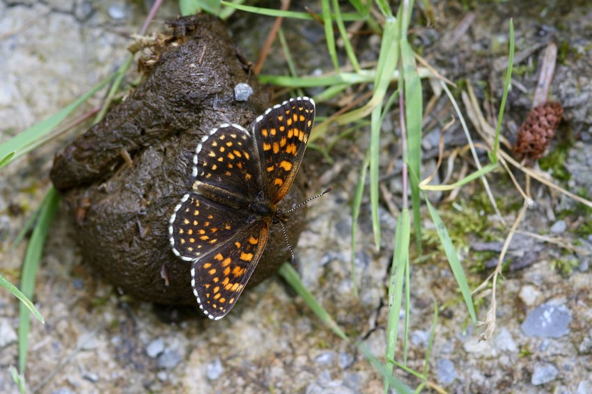 | Melitaea diamina | Feuchtwiesen, Lichtwaldsituationen, versaumte Halbtrockenrasen | Recht große Art, sehr dunkle Flügelober- und -unterseite, braun gekernte Halbmonde auf Flügelunterseite | Palpen meist dunkel | Palpen meist dunkel |