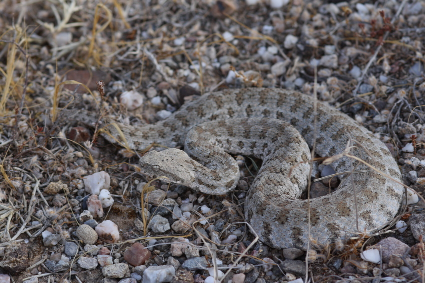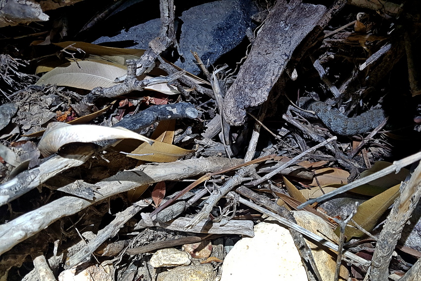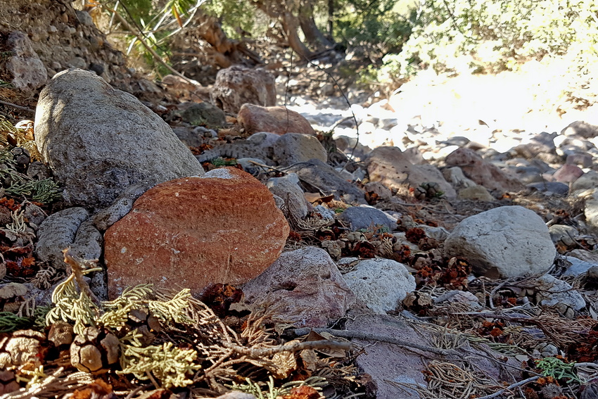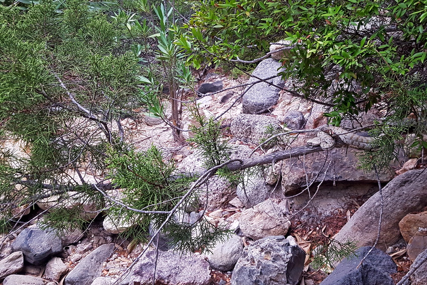 Am kommenden Morgen waren wir pünktlich zum Sonnenaufgang in einem uns sehr geeignet erscheinenden Lebensraum mit zahlreichen Lesesteinmauern und lückiger Macchiavegetation. Wir suchten erst entlang der Mauern, doch bis auf zahlreiche Ägäische Nacktfinger, Milos-Mauereidechsen und eine Haut, die wahrscheinlich zu einer Katzennatter gehörte, konnten wir nichts entdecken. Etwas demotiviert liefen langsam zurück zum Auto, bis auf einmal direkt vor uns eine adulte Milosotter lag und sich in der Morgensonne aufwärmte, Volltreffer! Nach längerem Fotoshooting zogen wir erleichtert weiter und erkundeten den Westen der Insel. Nach einer Erfrischung im bereits recht kühlen Mittelmeer an einem traumhaft gelegenen, komplett menschenleeren Sandstrand wanderten wir einen der zahlreichen Bachtobel entlang, die uns als bevorzugte Habitate der Milosotter beschrieben wurden. Und tatsächlich, obwohl die Temperaturen in der Mittagshitze 25 °C erreicht hatten, lagen zwei Individuen im Schatten in typischer Pose an Steine gepresst lauernd im Bachtobel direkt nebeneinander, was für ein Anblick! Die Tiere ließen sich von uns und unseren Kameras kaum stören und blieben liegen, bis wir voller Motivation weiter zogen. Trotz intensiver Suche konnten wir jedoch im weiteren Verlauf des Bachtobels nur noch eine Haut der Milosotter finden. Felsige Kaskaden mit atemberaubender Kulisse zwangen uns schlussendlich zur Umkehr. Natürlich schauten wir auch auf dem Rückweg, ob die beiden Vipern noch an Ort und Stelle waren, dem war jedoch nicht so, der Bereich sah so aus, als ob dort niemals eine Milosotter gelegen habe. Am Abend suchten wir bei Dunkelheit nochmals im Bereich der Legesteinmauern, weil wir uns hier noch den ein oder anderen Fund versprachen. Bis auf einige Geckos und eine große Tarantel war hier aber nichts zu holen, es hatte im Vergleich zum vergangenen Abend auch deutlich abgekühlt.