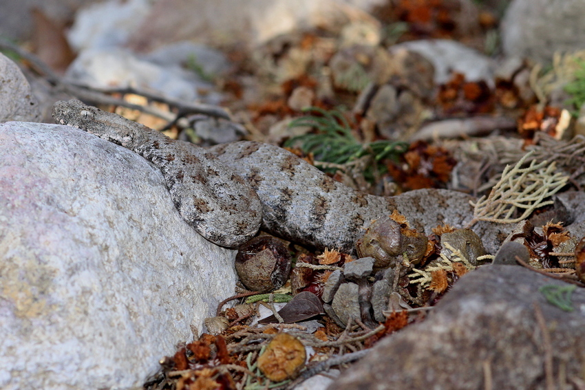 Fast unsichtbar im niedrigen Strauchwerk lauerte diese knapp 1 m lange Milosotter, die von uns "Steinviper" getauft wurde.