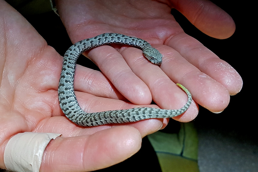 Eigentlich waren wir nach den ersten drei Tagen bereits vollkommen zufrieden mit unserer Ausbeute, aber wir hatten noch einen weiteren Tag für die Suche, den wir entsprechend nutzen wollten. Am frühen Morgen suchten wir im Bereich eines Sees, von dem es ebenfalls Nachweise der Milosotter gibt und an dem wir uns Hoffnung auf die Milos-Ringelnatter machten. Leider erbrachte die Suche nur zahlreiche Milos-Mauereidechsen, Ägäische Nacktfinger und den Panzer einer Griechischen Landschildkröte. Wieder zog ein Unwetter auf, es begann zu regnen und zu stürmen, sodass wir Zeit hatten, mit dem Auto den Osten und Süden der Insel zu erkunden. Gegen Mittag setzte sich die Sonne durch und es zog uns nochmals in den Westen der Insel, wo noch viele unerkundete Bachtobel auf uns warteten. Leider wehte stetig ein recht starker, böiger Wind, der uns eine erfolgreiche Schlangensuche fast unmöglich machte. Folgerichtig blieben wir in einem ziemlich offenen Bachtobel mit Ausnahme weniger Milos-Mauereidechsen erfolglos. Auf unserer Rückfahrt machten wir noch kurz Halt in einem stark von Bäumen überschirmten Bachtobel, der etwas windberuhigter schien. Wir rechneten nicht wirklich mit Funden, aber plötzlich lagen wieder zwei Milosottern direkt nebeneinander im ausgetrockneten Bachbett. Das eine Tier lag etwas komisch da und konnte auch nicht richtig flüchten, als wir näher kamen. Als wir etwa eine Stunde später nachschauten, war es bereits tot. In seiner Kloake steckte ein schwarzer Klumpen, sodass wir annehmen, dass es wahrscheinlich an einem Darmverschluss gestorben ist. Es war auch erstaunlich, dass wir nun bereits zum zweiten Mal zwei Individuen direkt nebeneinander gefunden hatten. Den Abend ließen wir bei einem leckeren Essen ausklingen und verzichteten aufgrund der bisherigen Funde auf eine weitere Nachtsuche. Bereits am nächsten Morgen ging unser Flug über Athen zurück nach München. Der Kurztrip war für uns ein voller Erfolg, insgesamt zehn Milosottern in vier vollen Suchtagen waren aus unserer Sicht eine ganz gute Quote. Verpasst haben wir dennoch einige der auf Milos lebenden Reptilien- und Amphibienarten, so die Milos-Ringelnatter, die Riesen-Smaragdeidechse, die Kaspische Bachschildkröte und die Wasserfrösche.