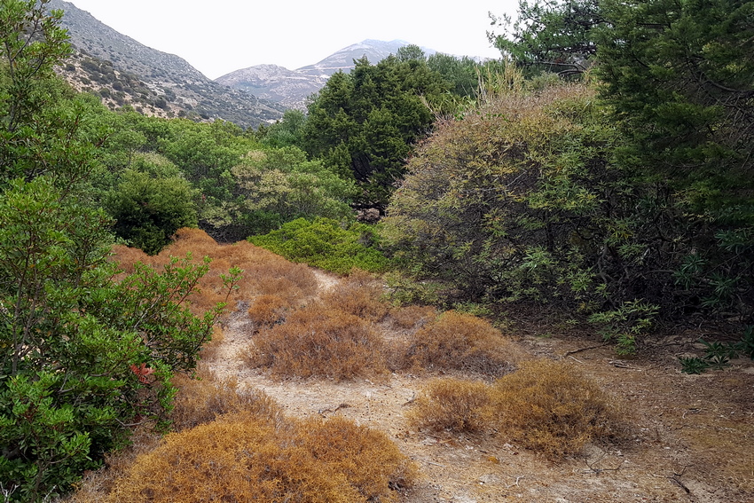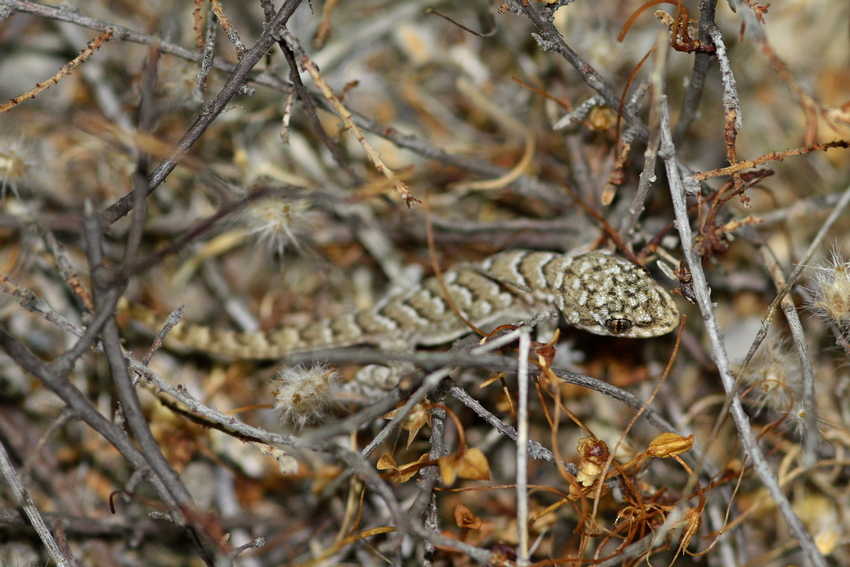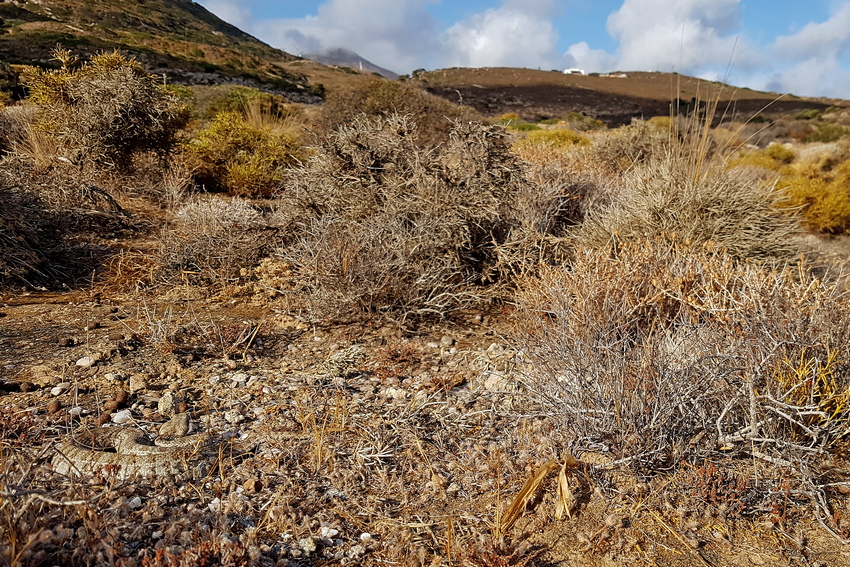 Nach den schönen Begegnungen des Vortags fuhren wir gleich am frühen Morgen in den Westen der Insel und stiegen in einen tief eingeschnittenen Bachtobel ein, der an einem Sandstrand ins Meer mündete. Bereits nach kurzer Zeit zogen dunkle Wolken auf, ein Gewitter kündigte sich an. Trotz fehlender Sonne und sinkender Temperaturen wollten wir unser Glück versuchen und drangen tiefer in den Tobel vor. Mehrere tote Ziegen säumten unseren Weg, woran die Tiere verendet waren, blieb uns ein Rätsel. Die Wolkendecke wurde immer dichter und erste Regentropfen fielen. Wir glaubten schon nicht mehr an einen Fund, als plötzlich direkt neben uns eine riesige, grau gefärbte Milosotter lauernd in einem niedrigen Strauch lag. Auch dieses Tier, das wir aufgrund seines urtümlichen Aussehens und seiner stoischen Art "Steinviper" tauften, blieb sehr lange liegen, bis es sich letzten Endes schnell davon machte, als wir einige Meter von ihm Abstand genommen hatten. Erst jetzt war die beträchtliche Größe dieses Individuums richtig zu erkennen, es maß in jedem Fall 80 cm, vielleicht auch mehr. Das Donnergrollen und erste Blitze waren jetzt nicht mehr zu ignorieren und wir beschlossen, schnellstmöglich den Rückweg zum Auto anzutreten. Also liefen wir den Bachtobel hinauf und wären fast in eine auf einem Ast lauernde Milosotter hineingelaufen! Auch dieses Tier verharrte einige Zeit bewegungslos, sodass wir gute Fotos schießen konnten. Wir erreichten unser Auto gerade noch rechtzeitig, bevor der Regen auf uns niederprasselte. Wir beschlossen zurück nach Adamas zu fahren und unser Glück am Nachmittag nach dem Regen nochmals zu versuchen. Wir erhofften uns sehr viel von dem Zeitfenster nach dem Regen, wenn die Tiere die Sonne zum Aufwärmen nutzen. Unsere Hoffnung wurde zunächst bestätigt, denn bereits nach wenigen Metern konnten wir eine weitere Milosotter beobachten, die sich allerdings schnell zurückzog. Leider brannte die Sonne bereits nach kurzer Zeit wieder erbarmungslos auf uns herunter und unsere Hoffnung schwand. Zurecht wie sich herausstellen sollte, denn die Suche im Bachtobel ergab keine weiteren Funde. Wir blieben bis zur Dunkelheit vor und vertrieben uns die Zeit am menschenleeren Strand, denn wir wollten den Tobel auch in den Abendstunden absuchen. Das Ergebnis war allerdings eher etwas enttäuschend, zwar fanden wir eine aktive Milosotter und mehrere Halbfingergeckos, aber wir hatten uns mehr erhofft. Allerdings waren wir auch nur etwas mehr als eine Stunde bei Dunkelheit direkt nach der Dämmerung unterwegs. Würde man zu dieser Zeit noch länger suchen, wären weitere Funde wahrscheinlich.