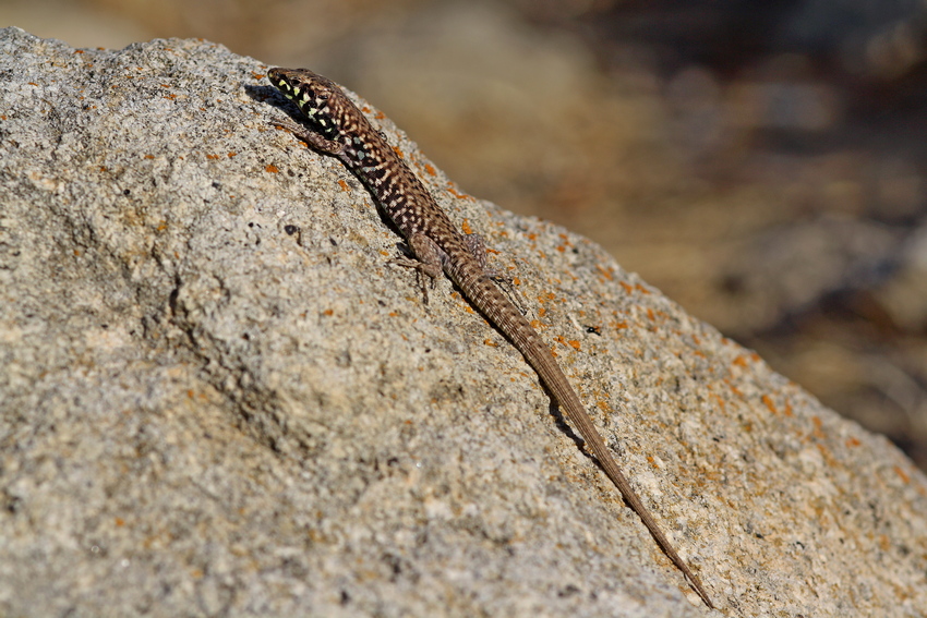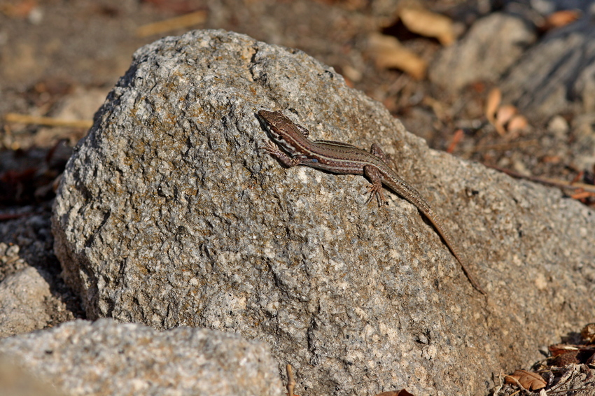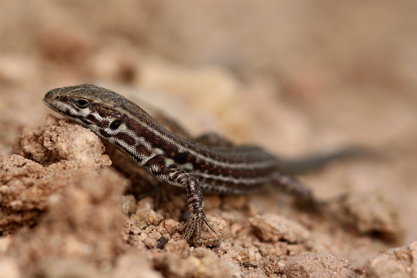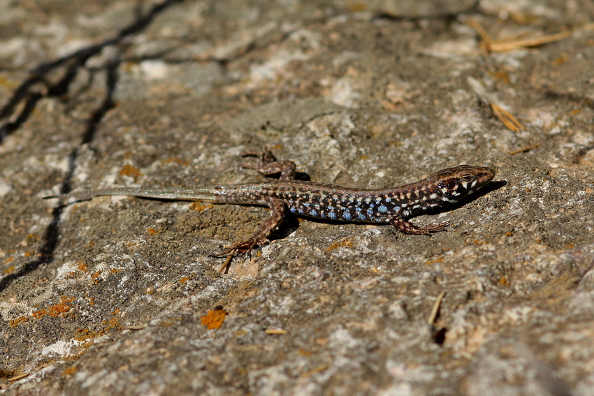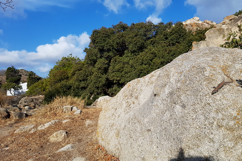 Sich sonnende Milos-Mauereidechse im offenen Gelände im Bereich des Sees.
