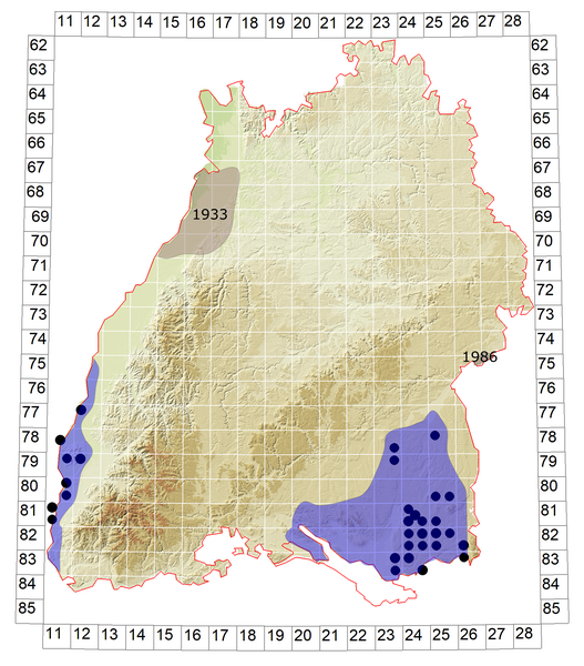Grauer Bereich: Ehemalige Vorkommen (letztes Nachweisdatum)