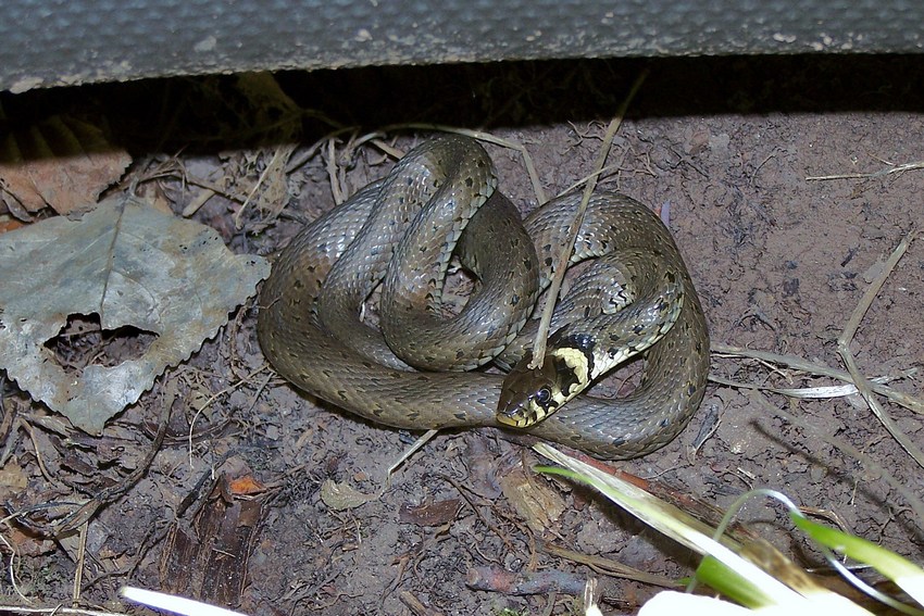 Adulte Östliche Ringelnatter unter einem Reptilien-Blech im Albvorland (NSG Schaichtal), Mai 2008.