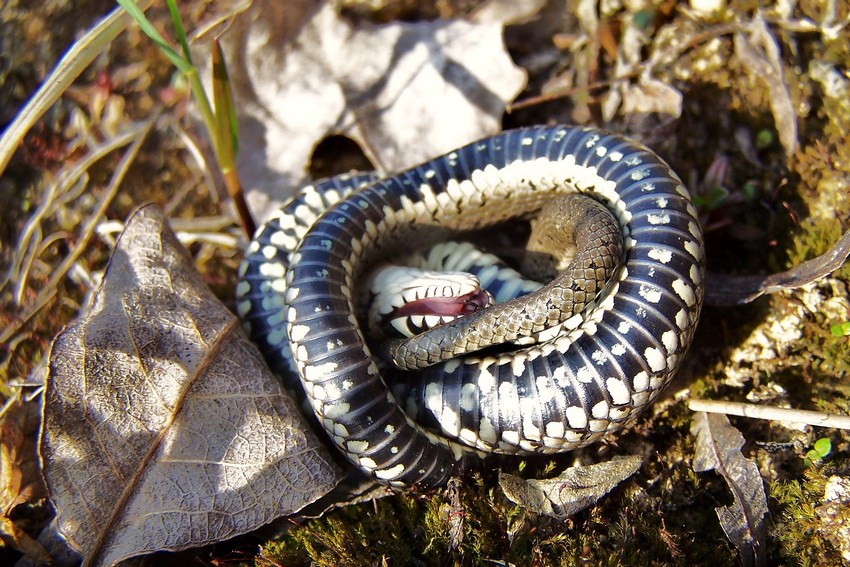 Totstellreflex der Östlichen Ringelnatter in Oberschwaben (Baltringen), April 2009.