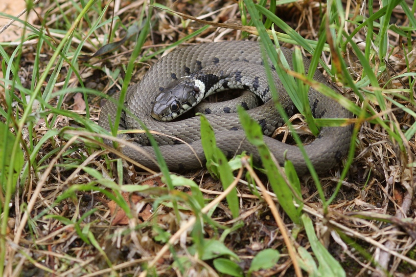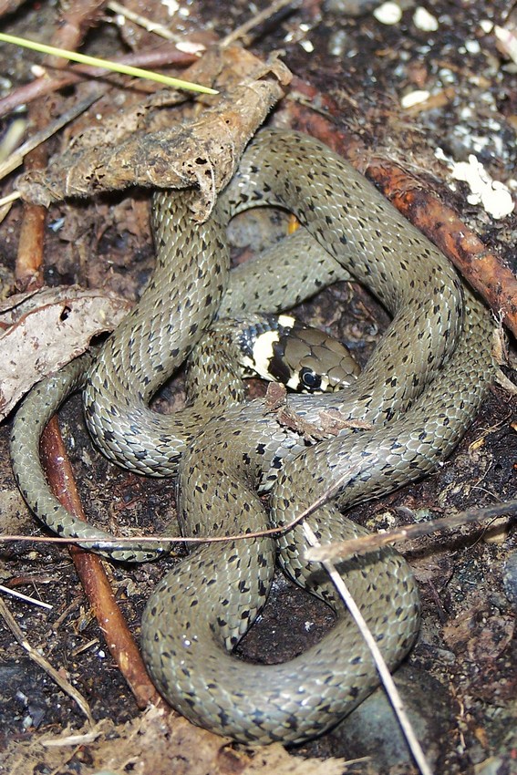 Semiadulte Östliche Ringelnatter aus einer Kiesgrube in Oberschwaben (Baltringen), April 2009.