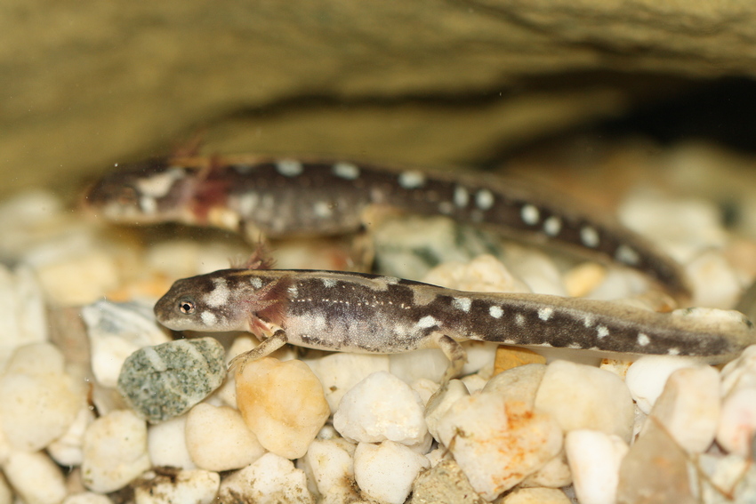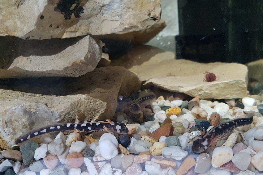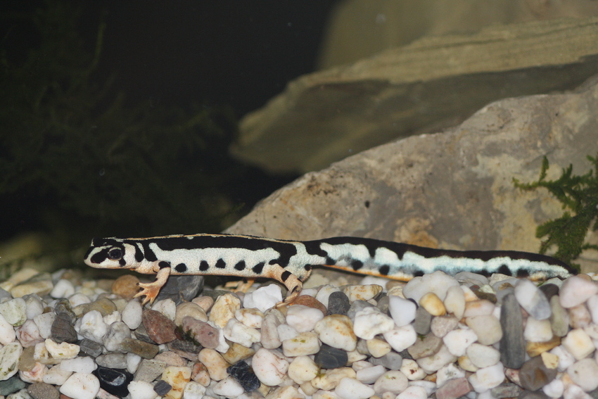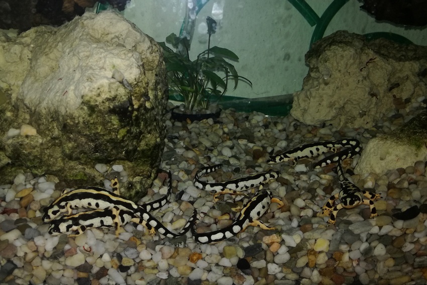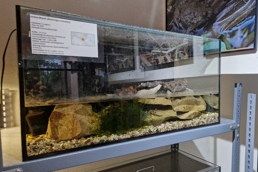 Aufzuchtaquarium für Larven des Bergbachmolches in Kombination mit der Haltung des Urmia-Molches (Neurergus crocatus). Die Vergesellschaftung funktioniert unproblematisch. Der Innenfilter sorgt für das dringend notwendig saubere Wasser. Steine, Rindenstücke und Mooskugeln bieten Versteckmöglichkeiten sowie für die Jungmolche die Möglichkeit des Landgangs, die allerdings selten genutzt wird.