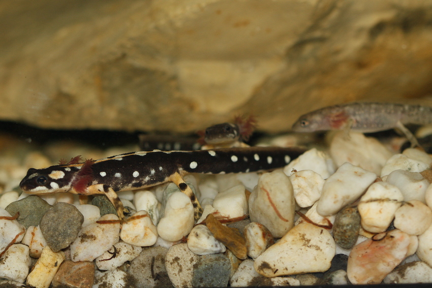 Im Winter 2020/21 wurden von den Weibchen fast ausschließlich unbefruchtete Eier gelegt, was ich auf einen Umzug in eine neue Wohnung zurückführte. Zusätzlich hatte ich Anfang 2020 auch ein Männchen durch einen Unfall verloren. Möglicherweise war das verbliebene Männchen nicht ausreichend, um in Paarungsstimmung zu kommen und genügend befruchtete Eier zu produzieren. Im Frühjahr 2021 erhielt ich immerhin noch ca. 15 Larven aus befruchteten Eiern, die ich zum einen in einer Kleingruppe und zum anderen in einer Einzelaufzuchtanlage für Froschlarven aufzog. Letztgenannte Methode ist sehr aufwändig, da jede Larve einzeln versorgt werden muss, jedoch schützt sie vor Kannibalismus. Meine Erfahrungen mit dieser Methode sind eher negativ: Die Larven wuchsen verhältnismäßig langsam und es gab einige Verluste. Wenige Larven lagen einfach tot in ihren Boxen, andere suchten den Weg nach draußen, da die Boxen nach oben hin offen sind. Die meisten Larven konnte ich auf diese Weise aber erfolgreich durchbringen, bis sie groß genug waren, um Kannibalismus auszuschließen. Ich setzte sie dann wieder zusammen in ein Aquarium und zog sie ohne Verluste bis zur Metamorphose groß. 11 Jungmolche konnte ich auf diese Weise aus den wenigen geschlüpften Larven erzielen.