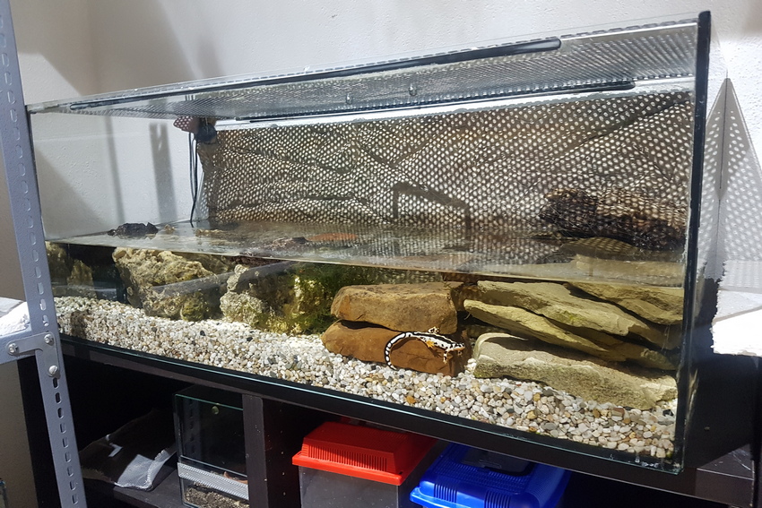 Im Winter 2015 erhielt ich sechs Jungtiere von Neurergus kaiseri, die sich später glücklicherweise als zwei Männchen und vier Weibchen herausstellten. Die Tiere bezogen ein Aquaterrarium mit den Maßen 80x40x40 cm, das etwa bis zur Hälfte mit Wasser gefüllt ist. Der Kies wurde auf einer Seite so hoch aufgeschüttet, dass ein Landteil entstand. Hier dienen einige Rindenstücke als Verstecke. Im Wasserteil bietet Lochgestein Versteckmöglichkeiten. Eine Wasserpflanze sowie zur Fortpflanzungszeit einige Schaumstoffteile, die gerne zur Eiablage genutzt werden, komplettieren die recht spartanische Einrichtung. Dies entspricht dem natürlichen aquatischen Lebensraum des Iranischen Bergbachmolchs, der ebenfalls als karg und arm an Vegetation beschrieben wird. Später stieg ich entsprechend dem Wachstum der Molche auf ein größeres Aquarium mit den Maßen 100x40x50 cm für die Adulttiere um. Den Landteil installiere ich mittlerweile mit Steinaufbauten, die aus dem Wasser ragen. Das Aquarium wird über einen Außenfilter betrieben. Der Deckel des Aquariums wird von einem abnehmbaren, aber gleichzeitig schweren und dicht schließenden Lochblech gebildet, das die Schläuche des Außenfilters in das Becken leitet. Es ist wichtig, dass keine größeren Lücken vorhanden sind, da die Molche sonst entkommen und in der Folge schnell austrocknen können. Das Becken wird nicht beleuchtet oder beheizt, solange andere Terrarien und Aquarien im Raum ausreichend Licht abgeben. Die Wassertemperaturen entsprechen daher der Raumtemperatur und bewegen sich je nach Jahreszeit zwischen 17 und 23 °C. Teilwasserwechsel (ca. 1/3) erfolgen zwischenzeitlich nur noch während der Eiablage- und Larvenzeit. Ansonsten wird lediglich verdunstendes Wasser nachgefüllt. Einmal jährlich sollte das gesamte Becken komplett ausgeräumt und gesäubert werden.