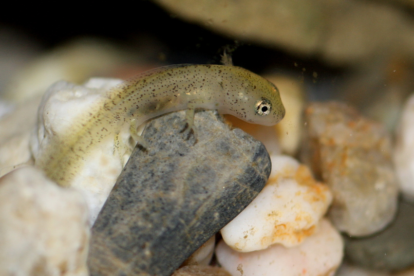 Einige Monate alte Larve des Iranischen Bergbachmolches.