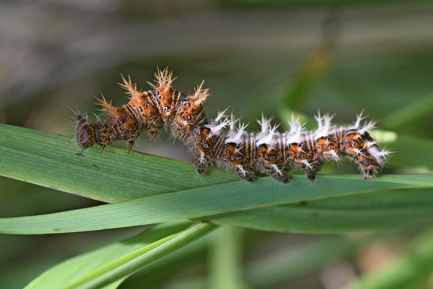 Ausgewachsene Raupe des C-Falters im württembergischen Allgäu (Wangen-Oberau), Juni 2019.