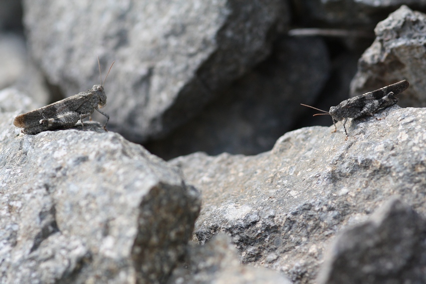 Pärchen der Rotflügeligen Ödlandschrecke auf einer Schutthalde im Hegau (Singen am Hohentwiel), August 2013.