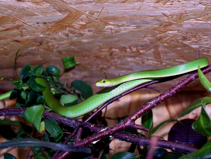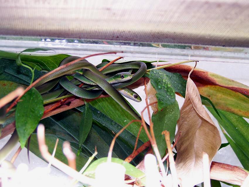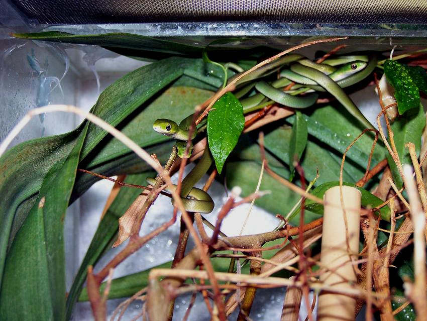Das adulte Tier hielt ich in einem Terrarium der Größe 50x50x70 cm. Es war dicht mit verschiedenen Pflanzen bewachsen und hatte einen Liegeplatz in Form eines Blumentopfes unterhalb der Decke. Außerdem waren ein großes Wasserbecken und ein Rindenstück im Terrarium untergebracht. Beleuchtet wurde mit einer UV-Lampe, damit die Schlange ihren Bedarf an Licht stillen konnte. Die Temperaturen lagen meist zwischen 25 und 27 °C. Wenn möglich sollten jedoch noch weitere Lampen (Strahler, T5) zugeschaltet werden, um den hohen Lichtansprüchen dieser tagaktiven Tiere gerecht zu werden.