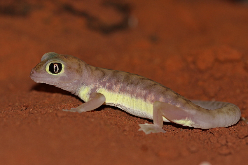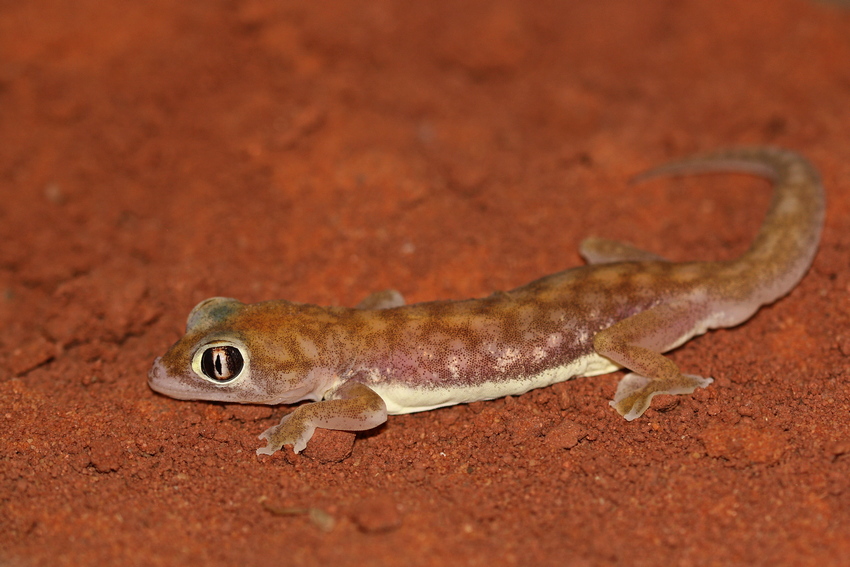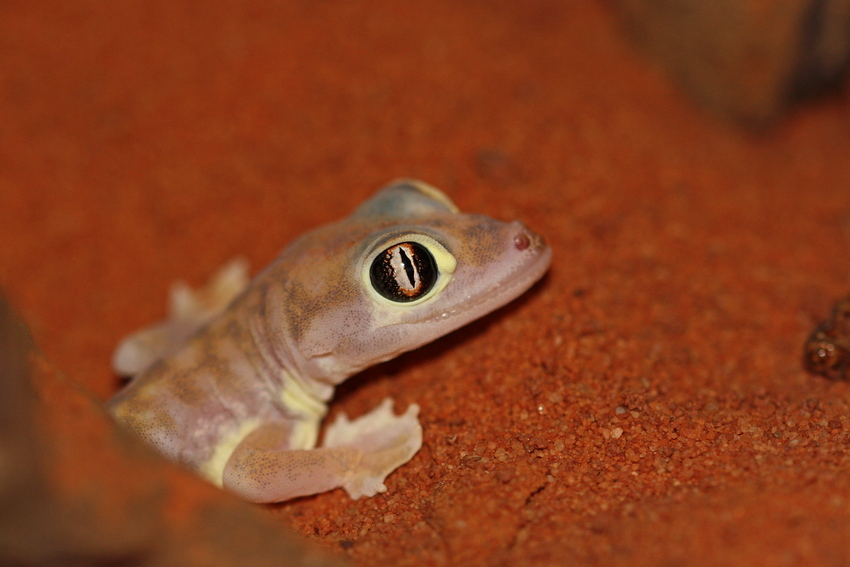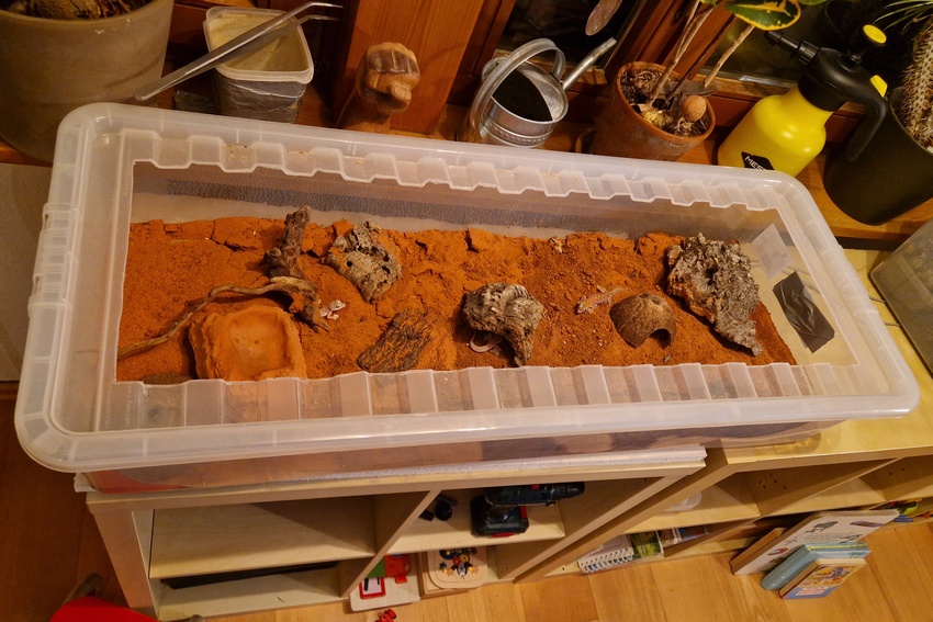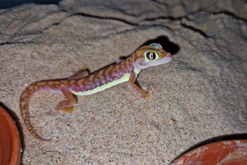 Im Laufe der vergangenen Jahre stellte ich mir eine Gruppe (1,2) dieses faszinierenden Wüstengeckos zusammen. Da die Tiere keine innerartliche Aggressivität aufweisen, ist eine Haltung in Gruppen, auch mit mehreren Männchen gut möglich. Zudem sind Namib-Wüstengeckos nicht in der Lage, senkrechte Wände nach oben zu klettern, was man sich bei der Gestaltung der Terrarien zunutze machen kann. Für die Haltung haben sich Plastikboxen bewährt, die nach oben hin offen sind. Regelmäßiges, morgendliches Sprühen imitiert dabei den Küstennebel der meernahen Wüstenbereiche. Durch die gute Belüftung trocknet das Wasser schnell wieder ab. Die Boxen werden mit feinkörnigem Sand ausgestattet, der mindestens 5 cm hoch eingebracht werden sollte, damit die Geckos graben und ihre Wohnhöhlen anlegen können. Zudem können Verstecke in Form von Plastik- oder Tontöpfen, Rindenstücken usw. angeboten werden. Eine Schale mit Kalzium komplettiert die recht spartanische Einrichtung. Unter etwa einem Drittel der Plastikboxen verlaufen Heizkabel, die für die notwendigen Tagestemperaturen von 25-28 °C sorgen. Meine zwei Plastikboxen haben jeweils eine Größe von 100x40x25 cm und sind miteinander über einen Durchgang verbunden. Hierdurch haben die Geckos viel Platz und können sich, wenn notwendig, gut aus dem Weg gehen.