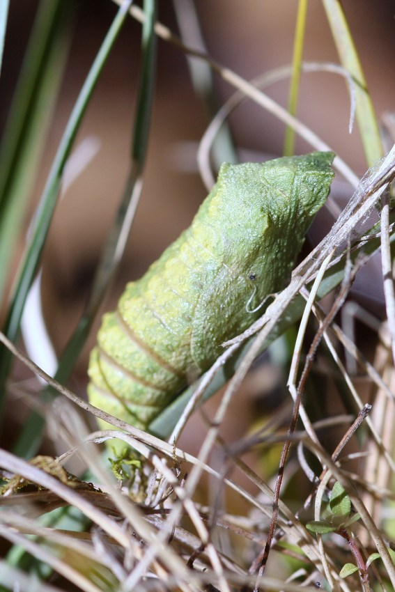 Puppe von P. machaon an einer südexponierten Böschung im Albvorland (Waldenbuch), Oktober 2010.