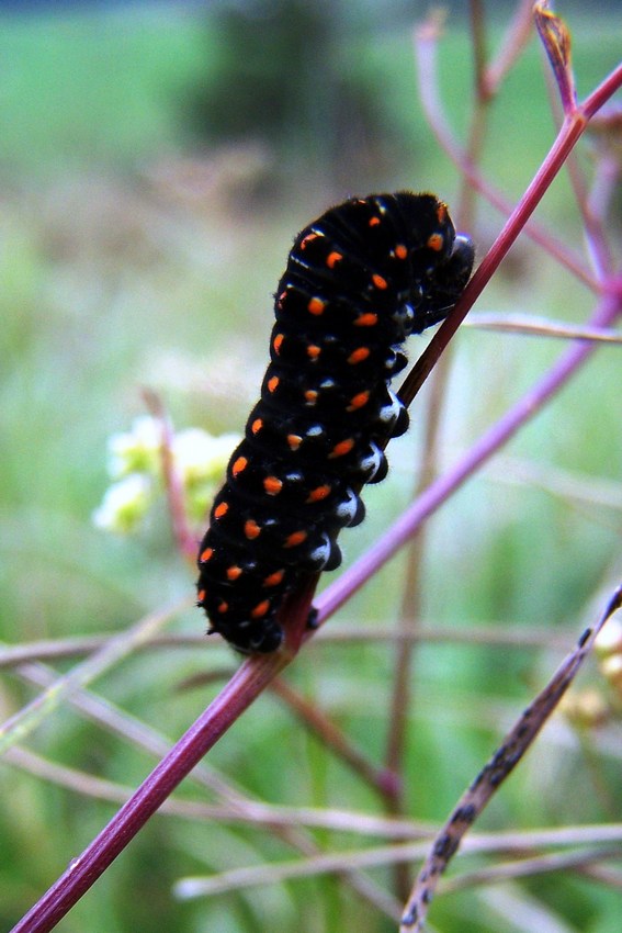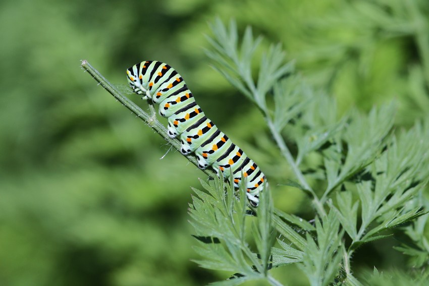 Diese Raupe des Schwalbenschwanzes fraß mit 15 weiteren auf einem Ackerstück im Albvorland (Waldenbuch) an Karotte, August 2011.