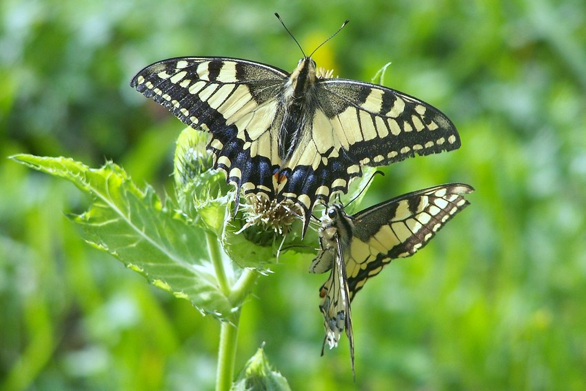 Zwei P. machaon saugend auf einer Kohldistel auf einer extensiv genutzten Feuchtwiese im Albvorland (Aichtal-Neuenhaus), Juli 2008.