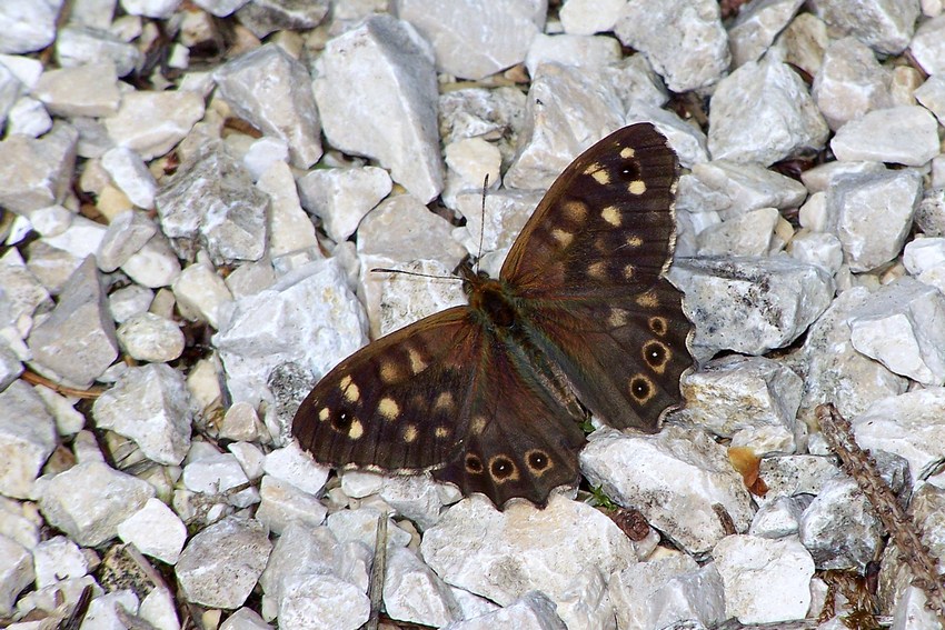 Waldbrettspiel (Pararge aegeria) auf einem Waldweg auf der Schwäbischen Alb (Veringenstadt), August 2009.