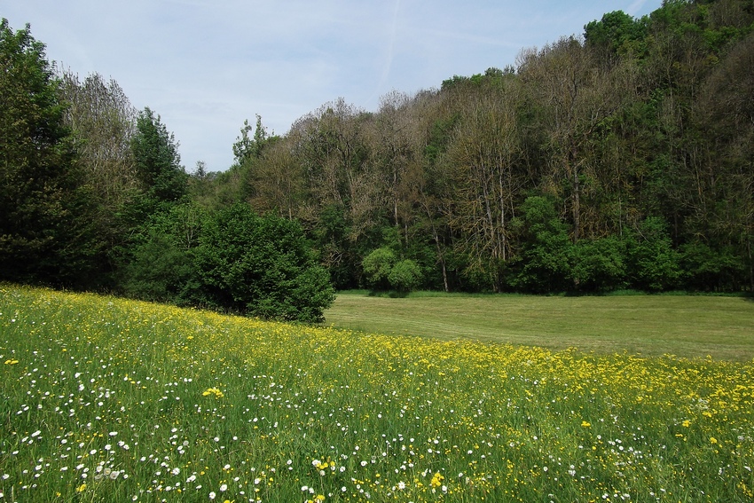 Luftfeuchtes, extensiv genutztes Wiesental in der Kocher-Jagst-Region, auch hier konnte P. plantaginis angetroffen werden.