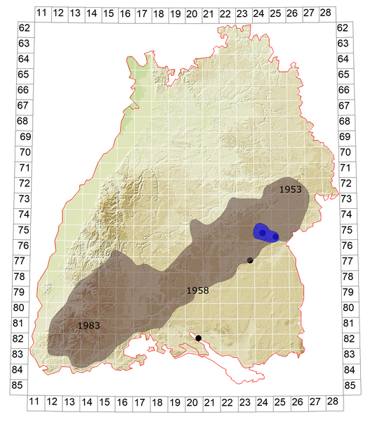 Grauer Bereich: Historisches Verbreitungsgebiet (letztes Nachweisdatum)