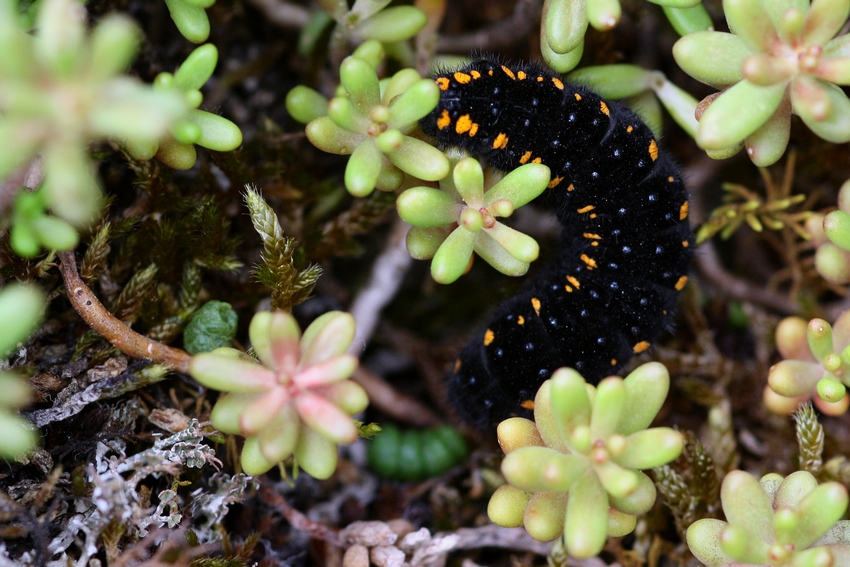 Jüngere Larve des Apollos an Fetthenne fressend auf der Schwäbischen Alb (Blaubeuren), Mai 2016.