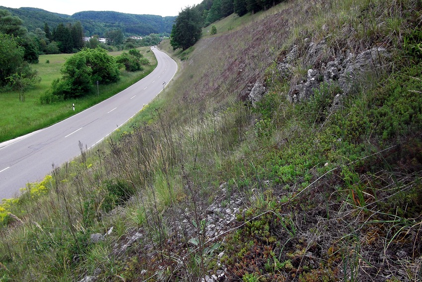 Anthropogen überformtes Habitat des Apollofalters, ein steiler, mit Drahtgitter geschützter Bahndamm auf der Schwäbischen Alb (Blaubeuren).
