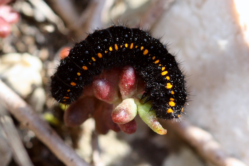 Fressende Raupe des Apollofalters im letzten Larvenstadium am südlichen Albtrauf, Mai 2014.