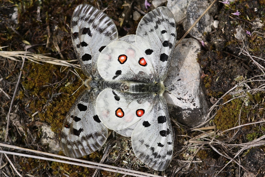 Sich sonnendes Männchen von P. apollo auf der Schwäbischen Alb (Blaubeuren), Mai 2014.