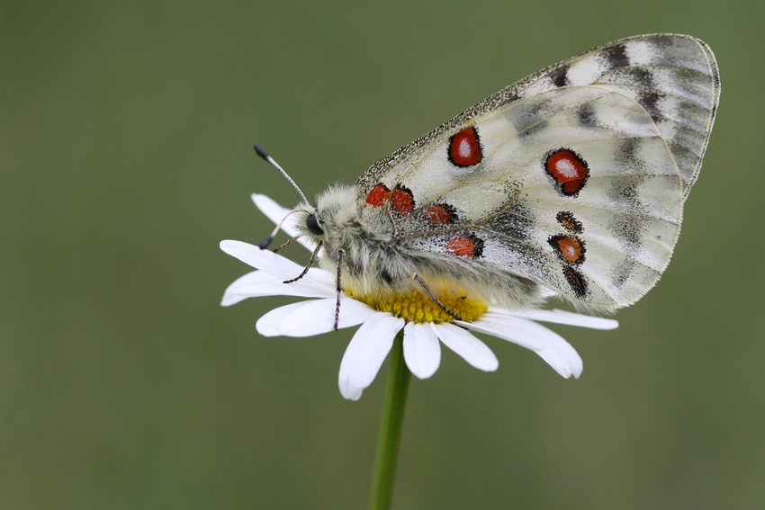 Recht frischer Roter Apollofalter (Paranssius apollo) am letzten baden-württembergischen Standort auf der Schwäbischen Alb (Blaubeuren), Juli 2010.
