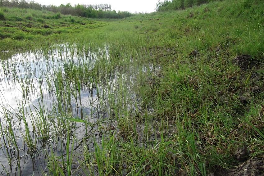 Potentielles Laichgewässer der Knoblauchkröte am nördlichen Oberrhein (Philippsburg), wassergefüllte Senken in Grünlandbrachen.