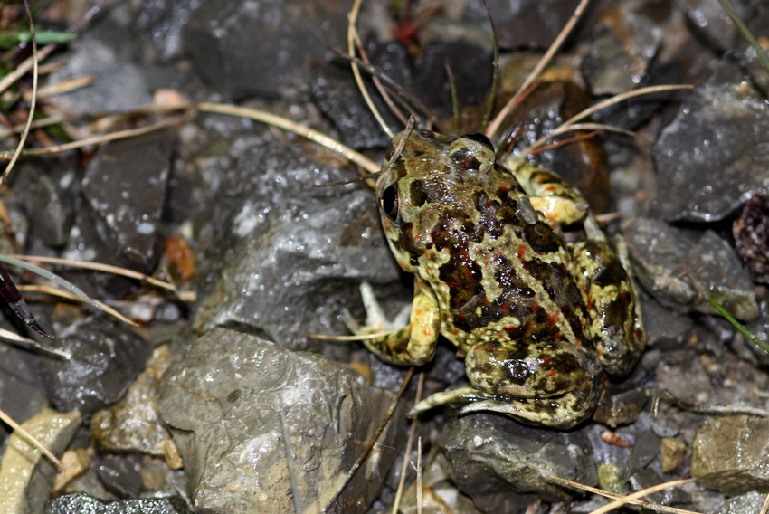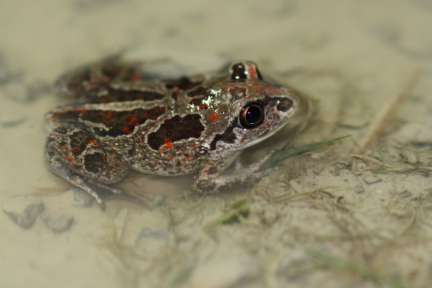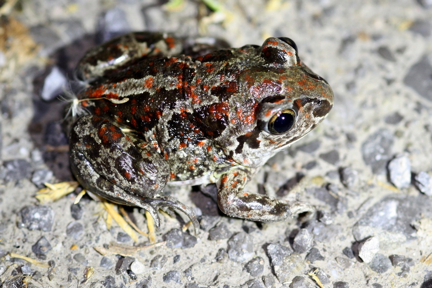 Knoblauchkröte mit ausgeprägter Rotfleckung am nördlichen Oberrhein (Philippsburg), April 2020.