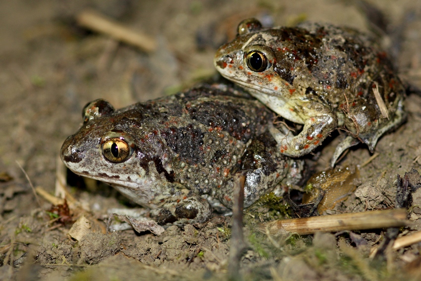 Männliches (rechts) und weibliches (links) Tier der Knoblauchkröte am nördlichen Oberrhein (Philippsburg), April 2015.