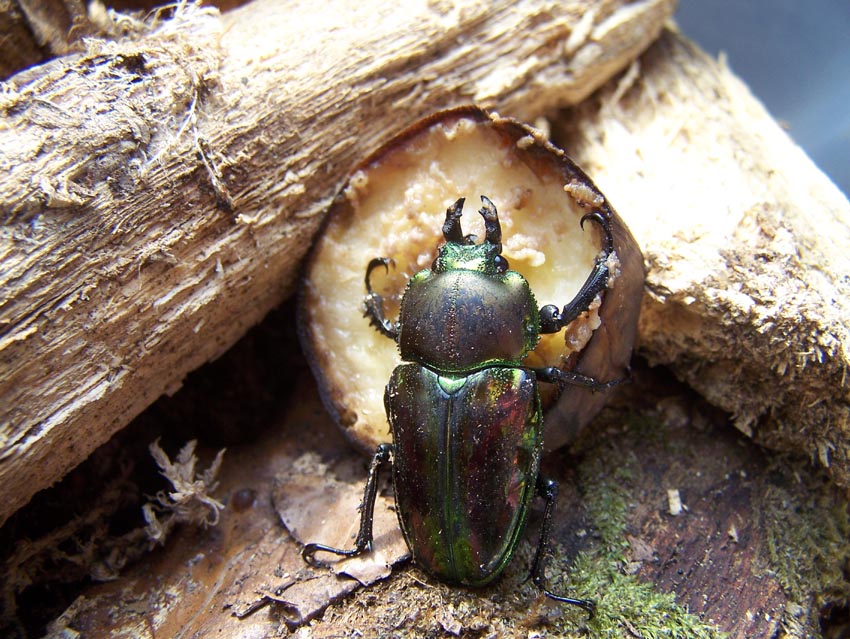 Die Haltung erfolgte bei mir in einer Plastikbox der Größe 50x30x30 cm, die bis fast ganz oben mit einem Gemisch aus weißfaulem Holz (75 %) und Waldhumus (25 %) gefüllt war. Tagsüber waren die Käfer nicht zu sehen, nachts jedoch kamen sie an die Oberfläche, um zu fressen und sich zu verpaaren. Ich bot pure Banane und ein Gemisch aus Banane und Naturjoghurt, beides wurde, im Gegensatz zu mit Protein angereichertem Gelee, gut angenommen.