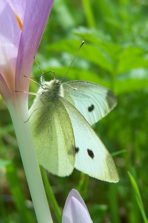 Ein Kleiner Kohlweißling (Pieris rapae) saugt an einer Herbstzeitlosen im Albvorland (NSG Schaichtal), September 2008.