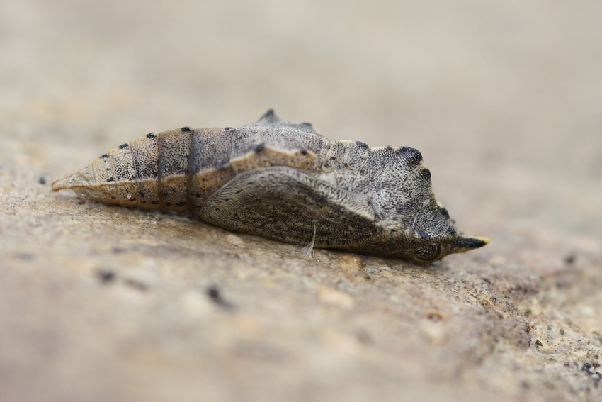 Puppe des Kleinen Kohlweißlings an einem Lesestein im Albvorland (Wurmlingen), April 2016.