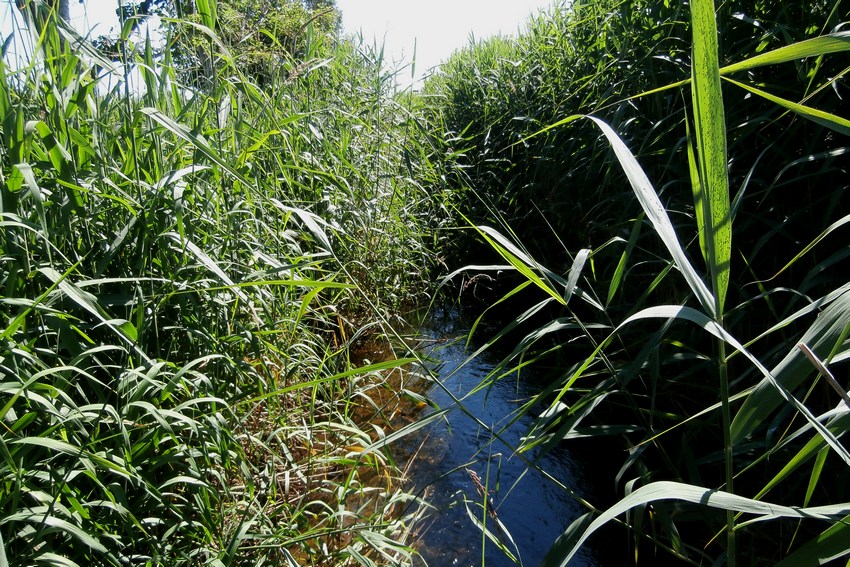Weiterer Einblick in das Habitat der Federlibelle in Oberschwaben (Kißlegg), ein mit Schilf bestandener Graben.