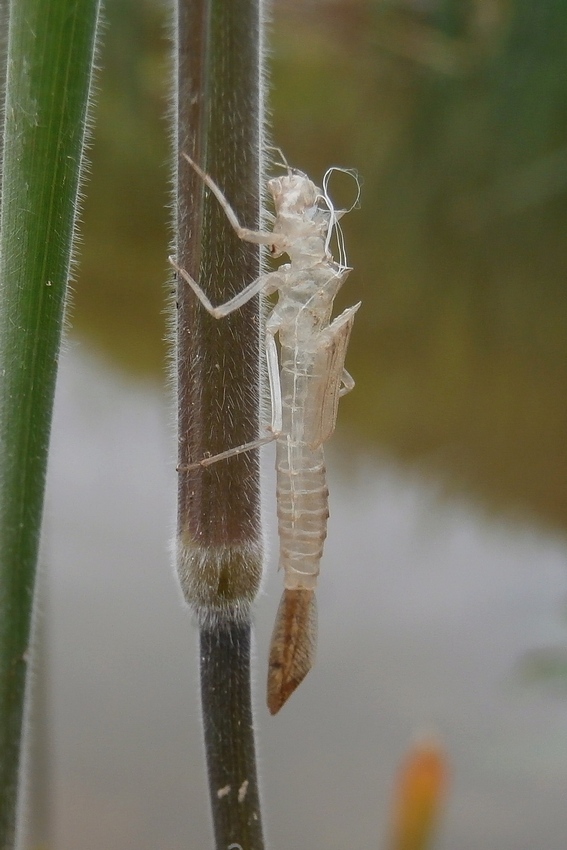 Exuvie der Federlibelle an einem Stillgewässer in Oberschwaben (Baltringen), Juni 2016.