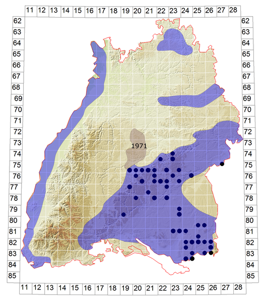 Grauer Bereich: Ehemalige Vorkommen (letztes Nachweisdatum)