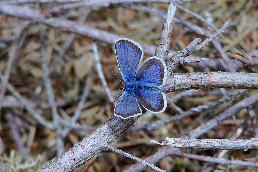 Männchen des Argus-Bläulings (Plebejus argus) in einem lichten Waldbereich mit angrenzenden Magerrasen auf der Schwäbischen Alb (Emeringen), Juni 2009.