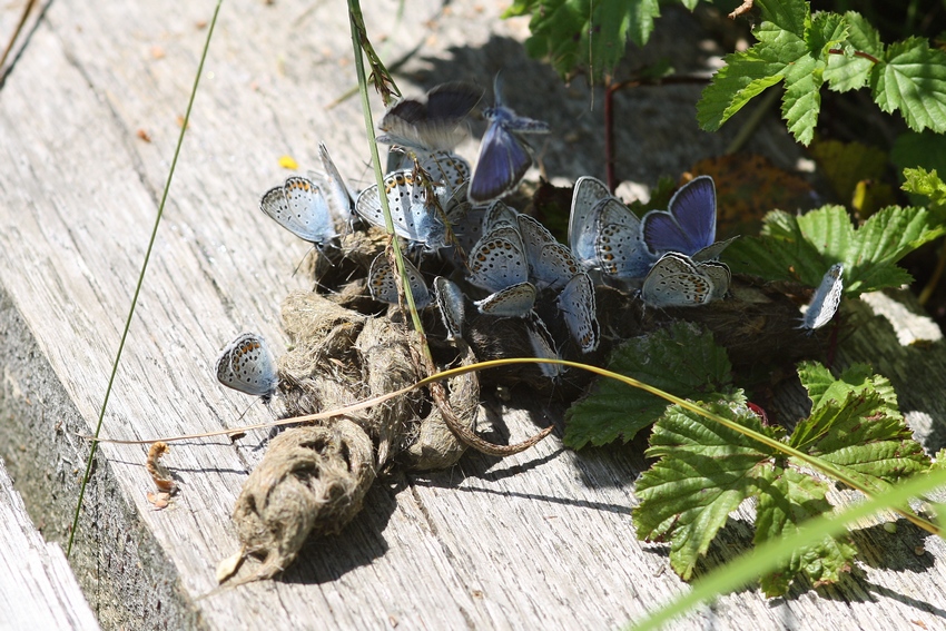 Zahlreiche Argus-Bläulinge und ein Wachtelweizen-Scheckenfalter (Melitaea athalia) an Fuchskot saugend in Oberschwaben (Moosburg).