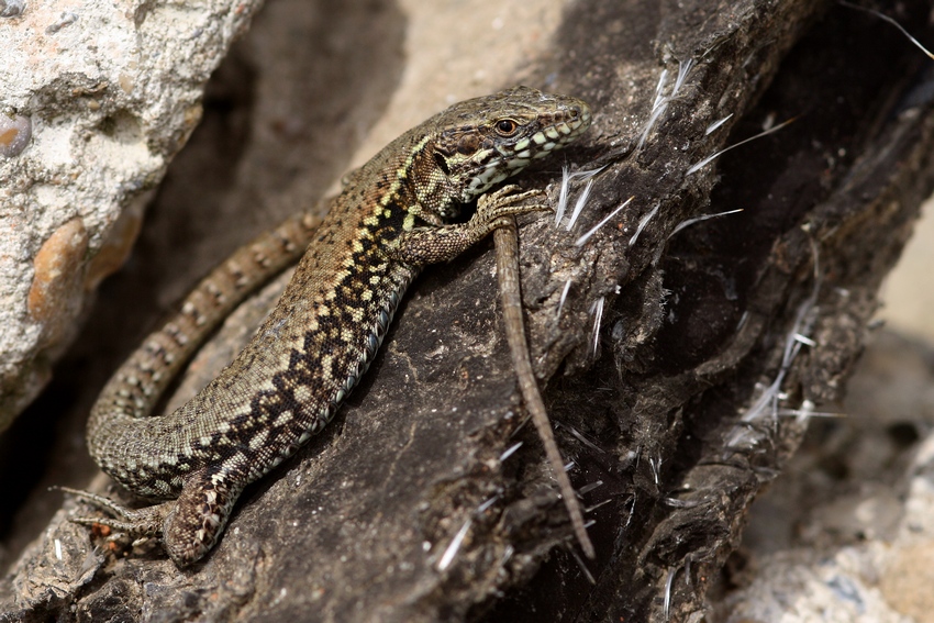 Sich sonnendes Weibchen von Podarcis muralis auf einem Felskopf im Südschwarzwald, April 2011.
