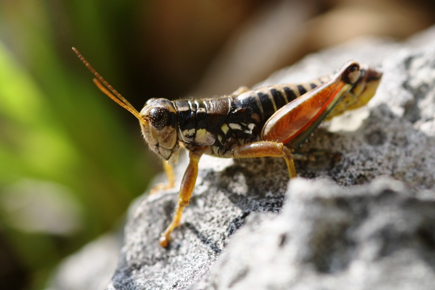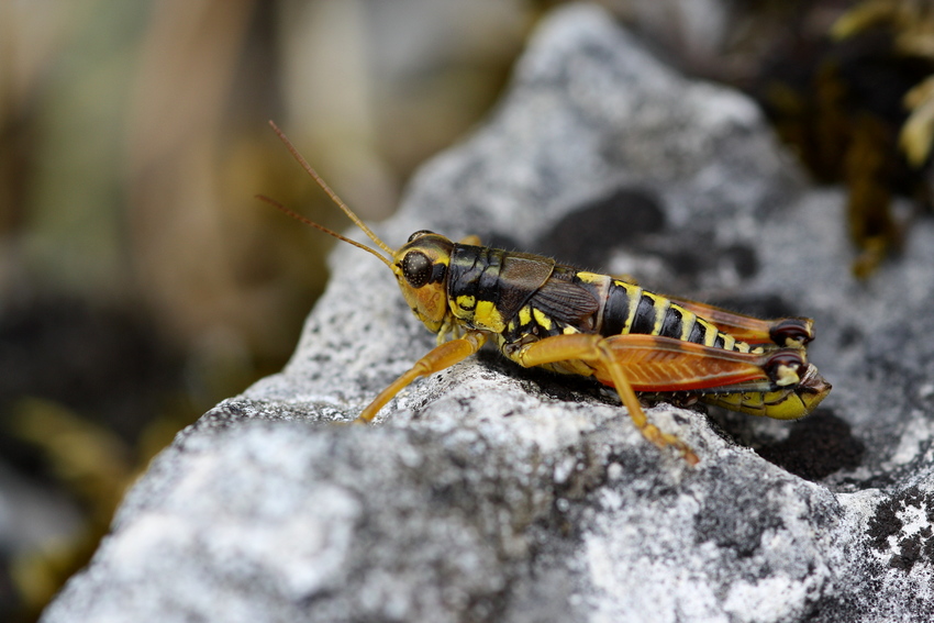 Die Gewöhnliche Gebirgsschrecke im Lebensraum auf Felsköpfen im Oberen Donautal (Neidingen), Juli 2020.