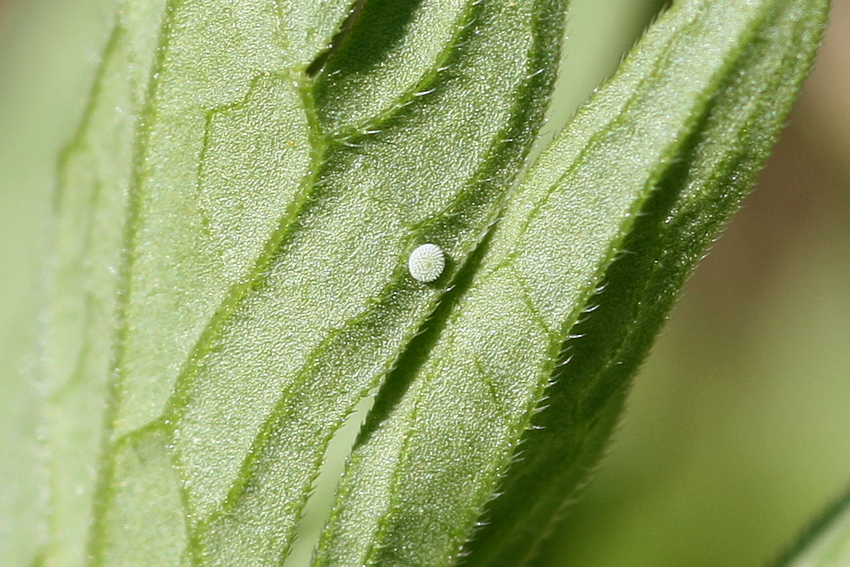 Ei des Kleinen Sonnenröschen-Bläulings an Wiesen-Storchschnabel im Albvorland (Dettenhausen), Juni 2017.