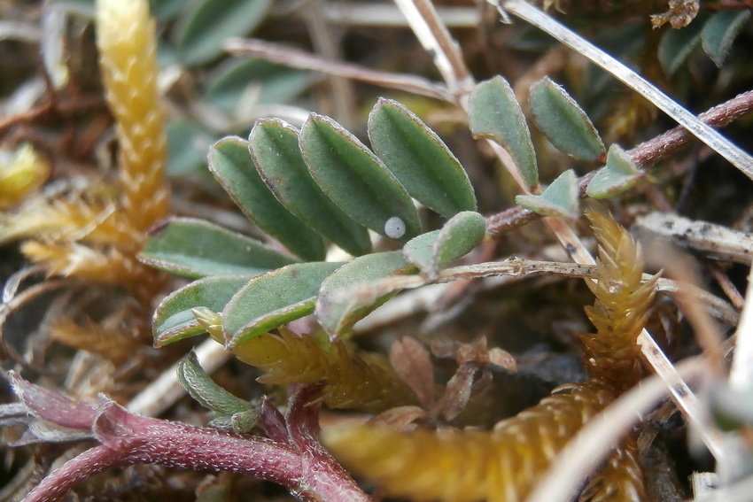 Ei des Silbergrünen Bläulings an Hufeisenklee in den Oberen Gäuen (Schafhausen), März 2018.